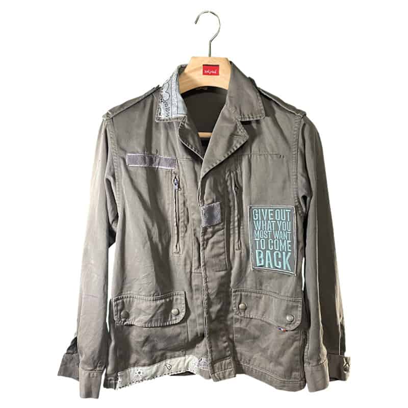 Vestes kaki vintage customisées. Chaque pièce créée raconte sa propre histoire. Traces d’usures, tâches et déchirures confèrent à mes vestes un style unique portant les marques du passé.